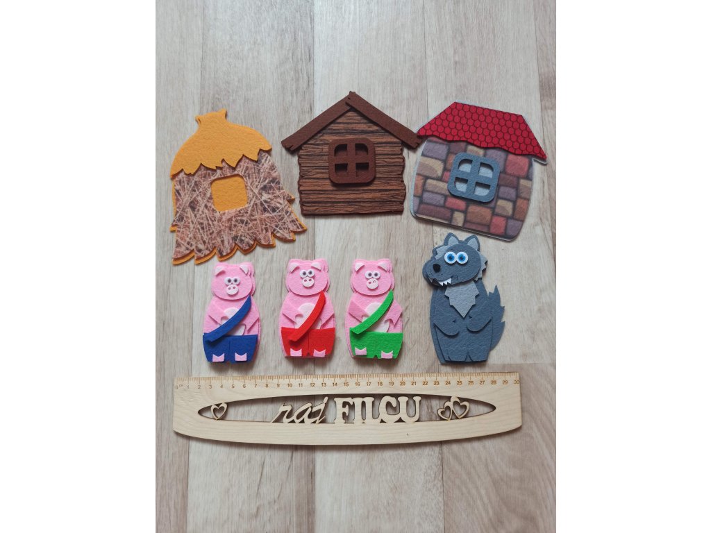 Ein Set von Ausschneidevorlagen nach dem Märchen "Die drei kleinen Schweinchen", einschließlich der Häuser und des Wolfs, zum Zusammennähen.